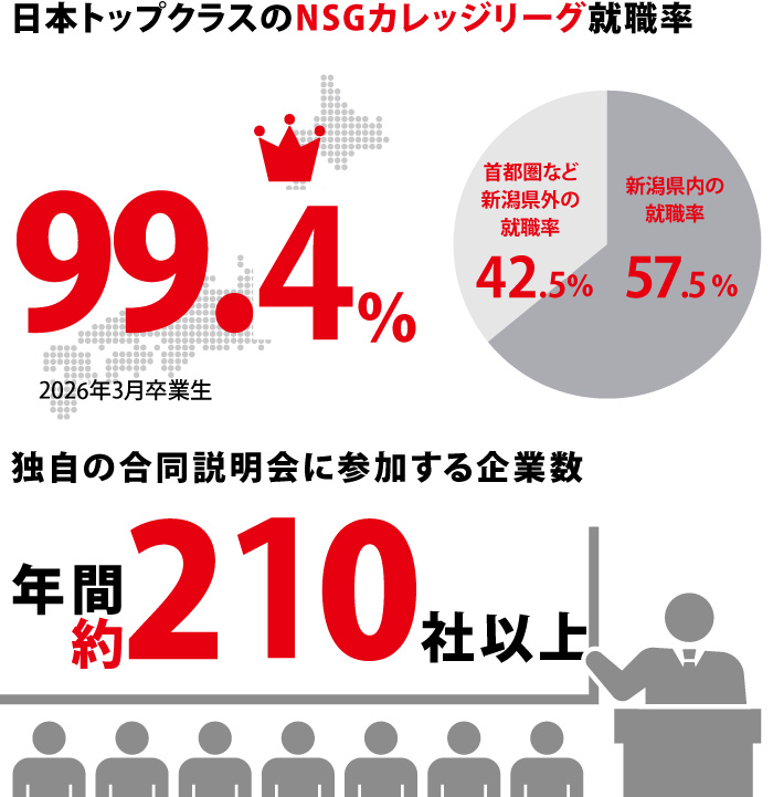 NSGカレッジリーグは各校の専門分野において企業と連携し、就職だけでなく、専門教育の連携やインターンシップの実施など、職業人の育成に取り組んでいます。就職指導ノウハウを全校で共有し、研修や指導を行うことで、毎年高い内定率を維持しています。
